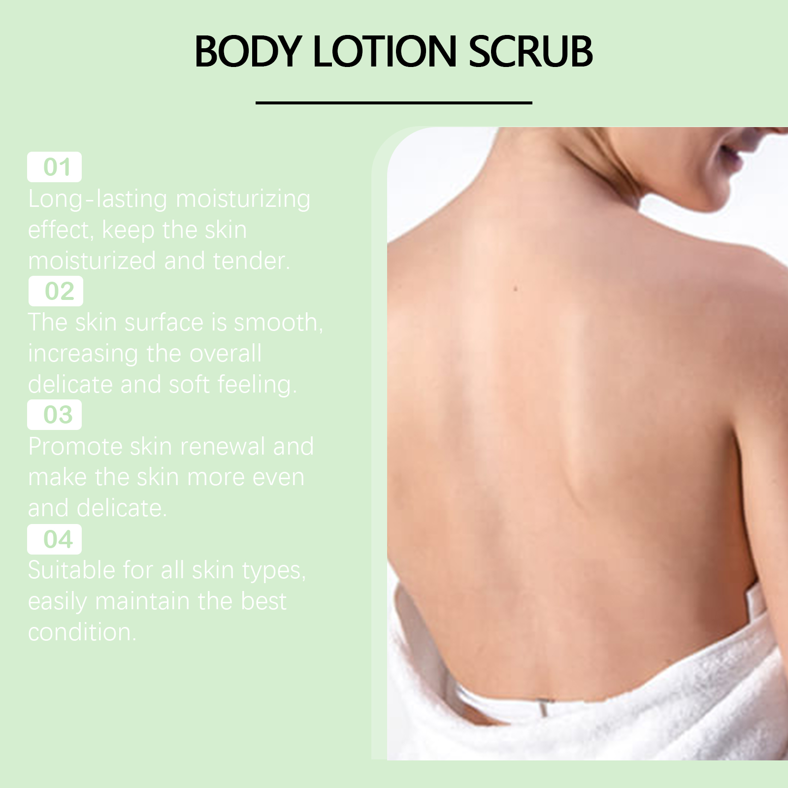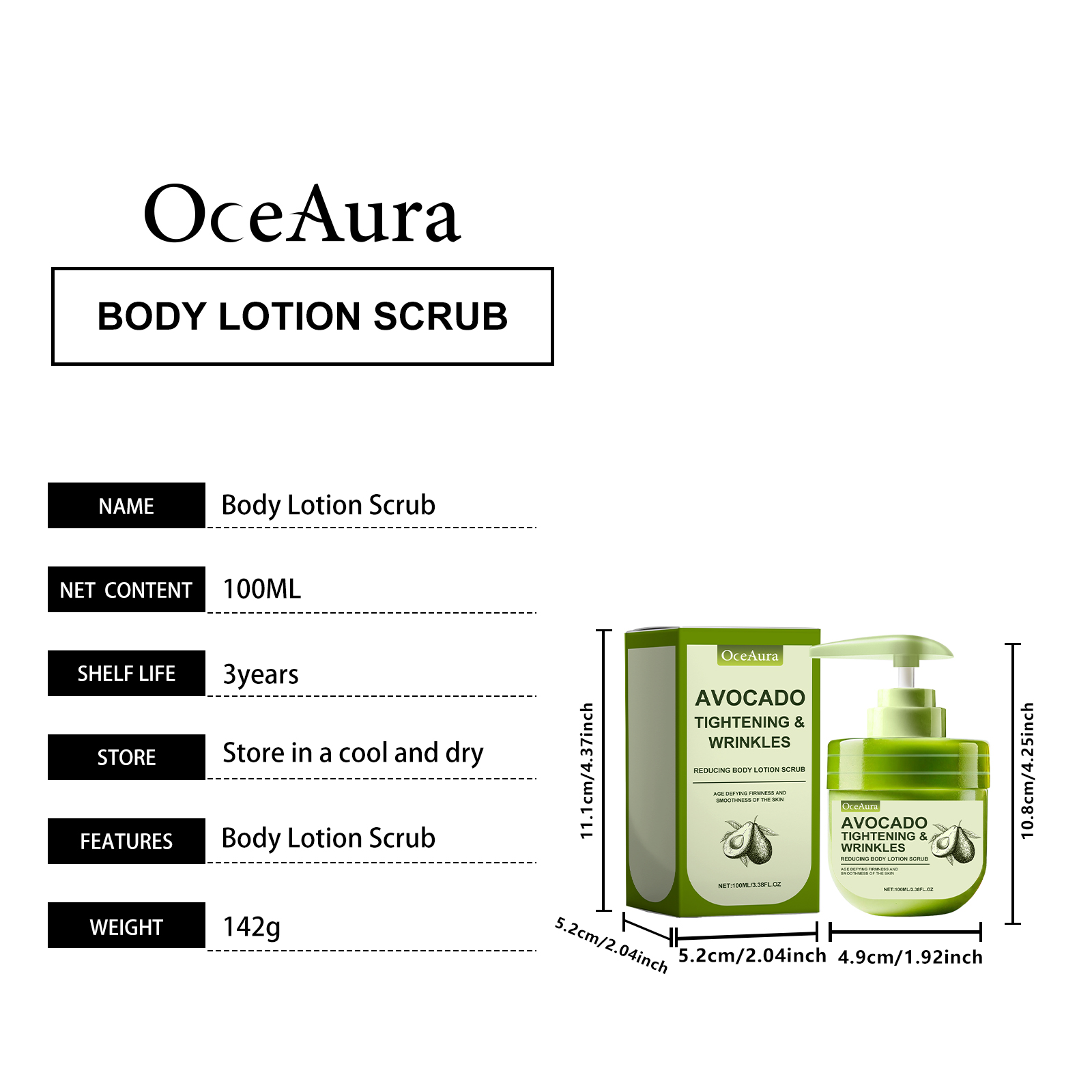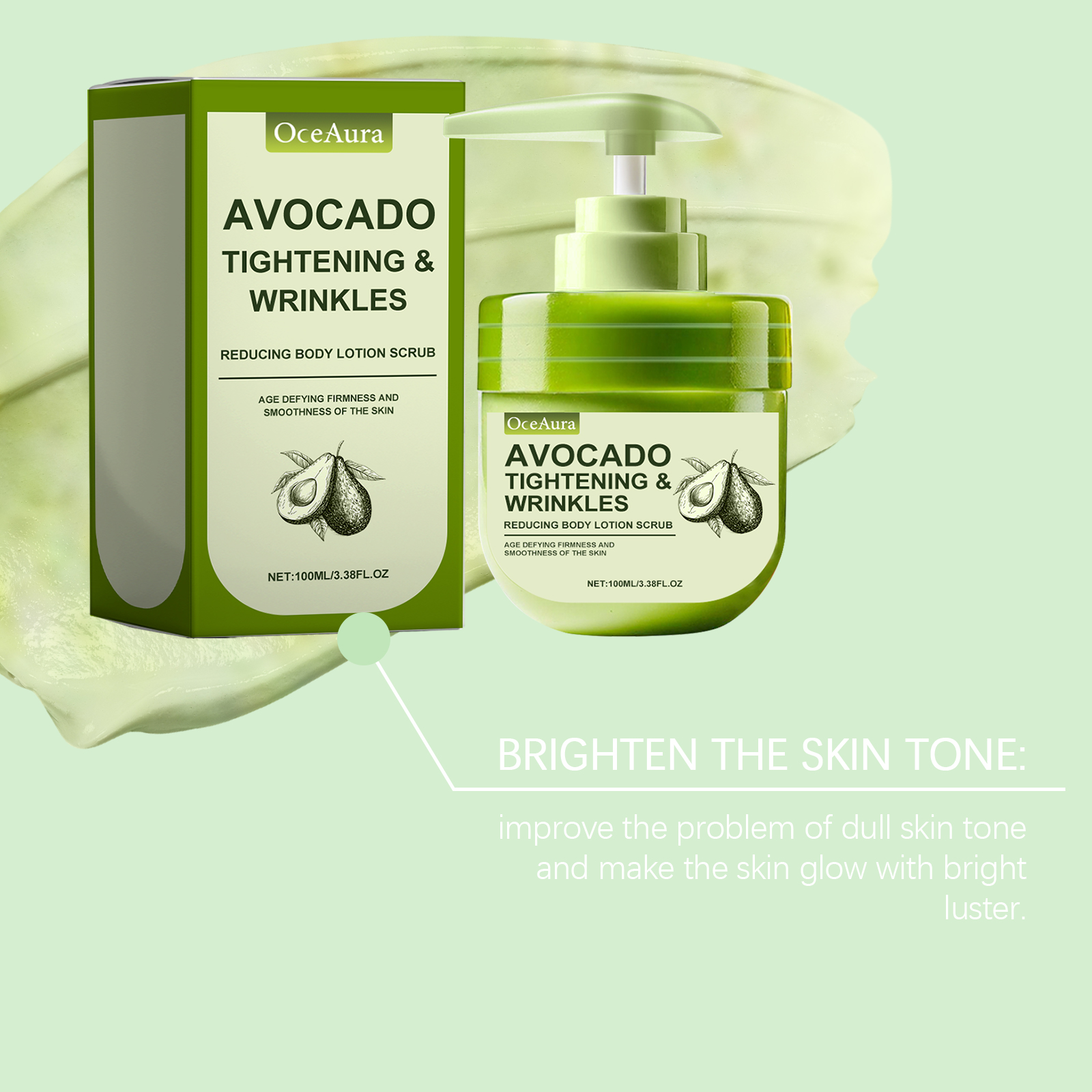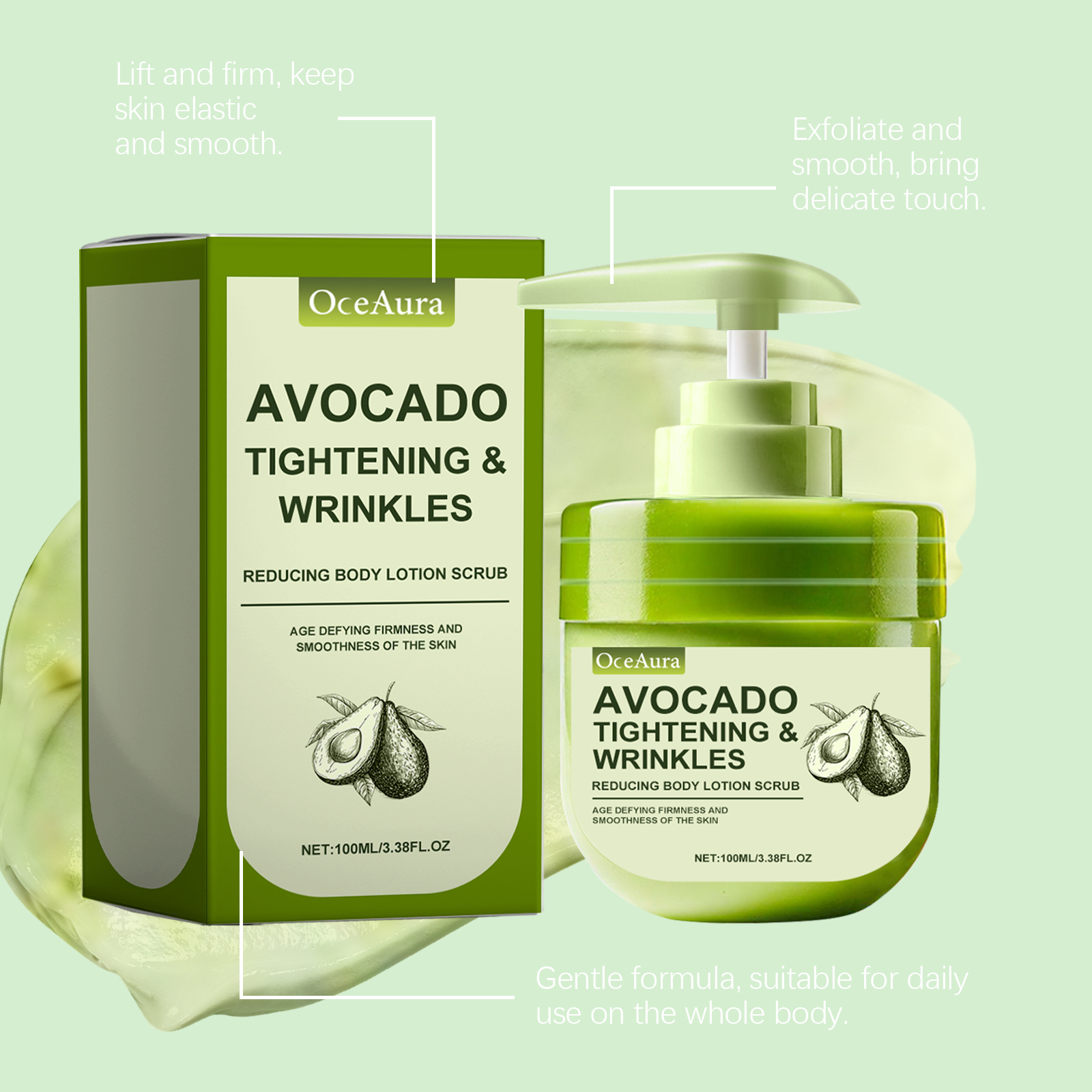 Our Avocado Scrub Body lotion contains shea butter, avocado oil, aloe vera extract. It can effectively help to restore skin firmness. Make the body line more delicate and flexible. Its application method is simple: 1. Clean the skin and keep it dry. 2. Apply proper amount of the product to the whole body and massage in a circular motion for 1-2 minutes. 3. Wash it off with clean water. After use, the skin is smoother and more delicate, fine lines are reduced, and confidence is enhanced.