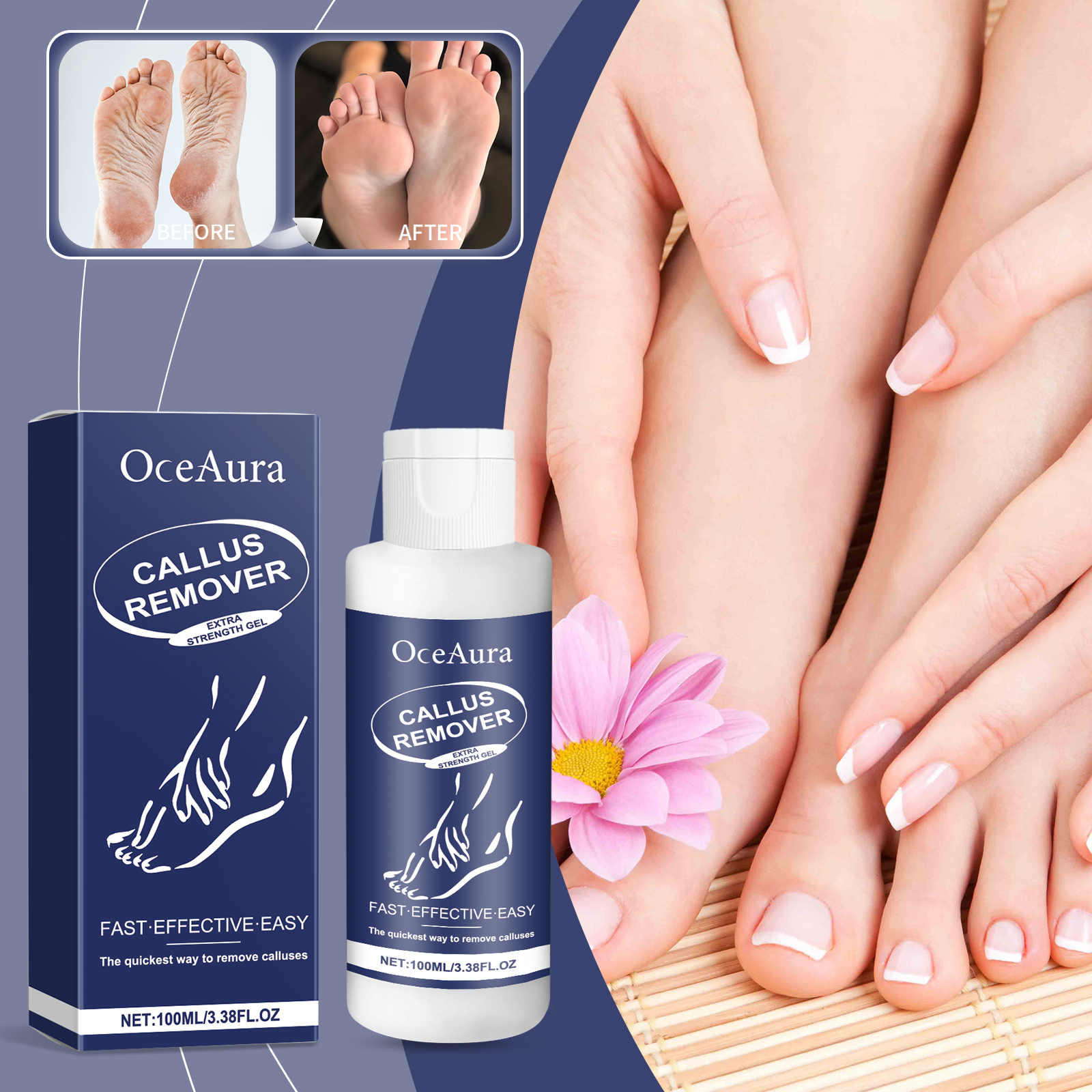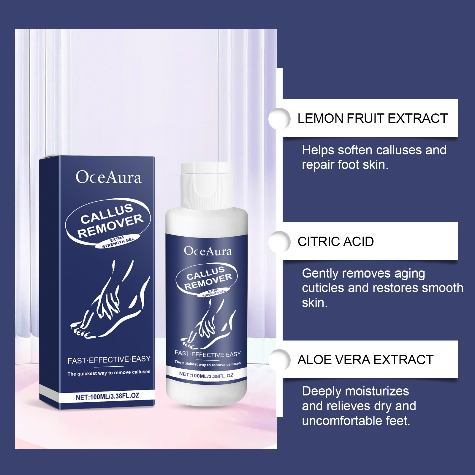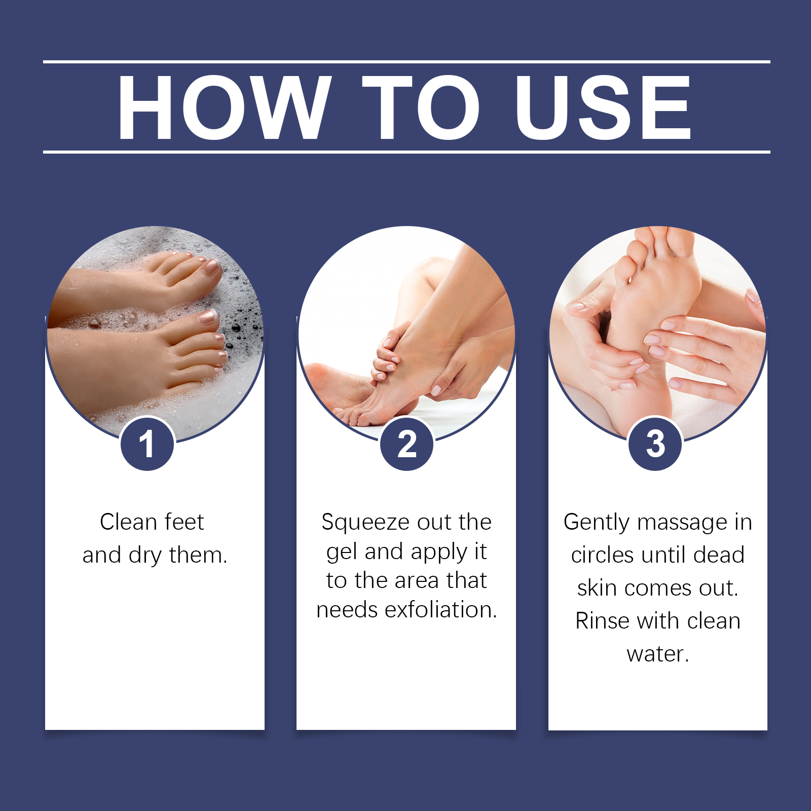 Our foot exfoliating gel contains lemon fruit extract, citric acid, aloe vera extract. It can deeply penetrate the hardened cuticle, quickly soften the foot scab, and easily remove stubborn dead skin. The way to use it is simple: 1. Wash and dry your feet. 2. Squeeze out the gel and apply to areas that need to be exfoliated. 3. Gently massage the circle until the dead skin is gone. Rinse with water. Rich in moisturizing ingredients, soft and deep nourish skin, keep feet soft and smooth.