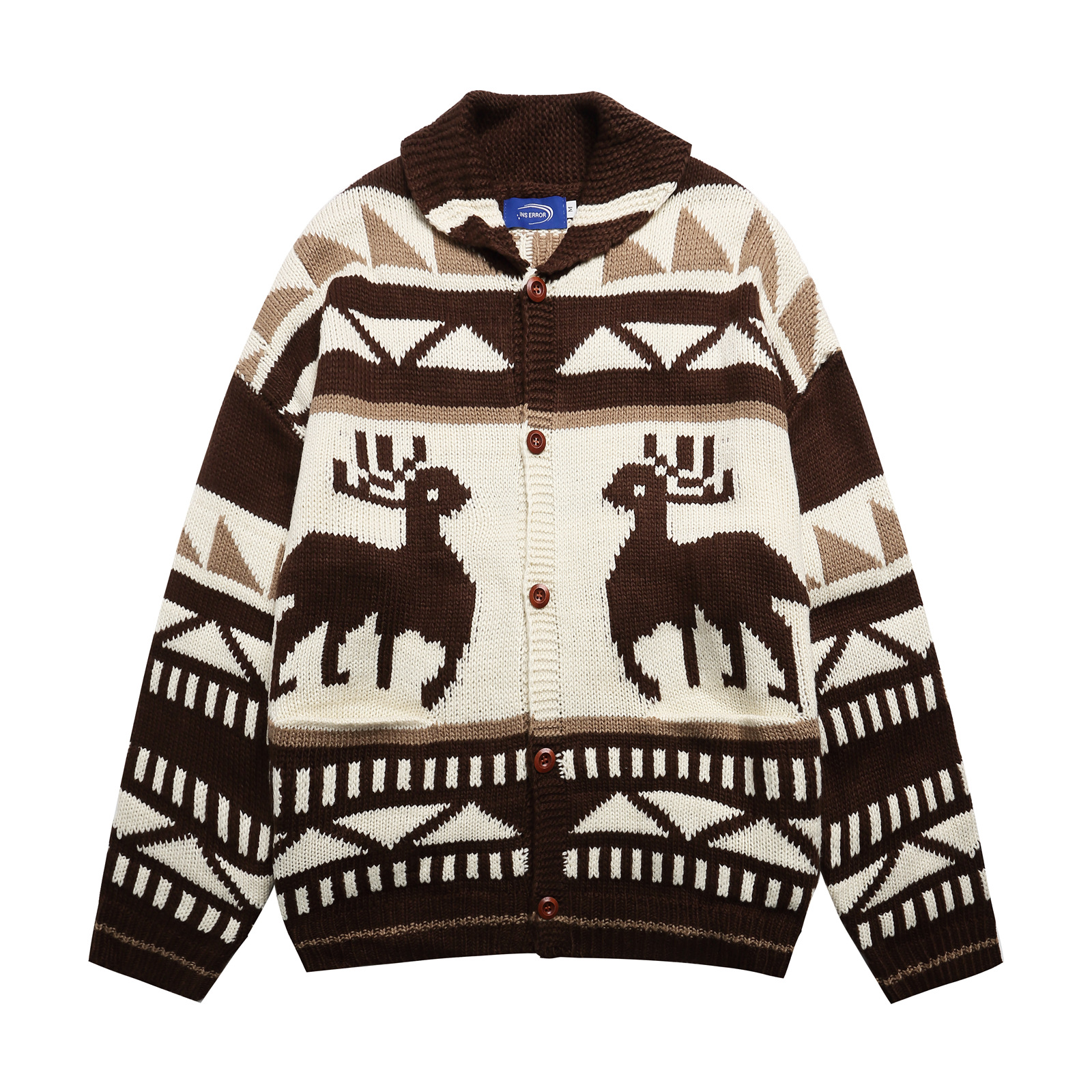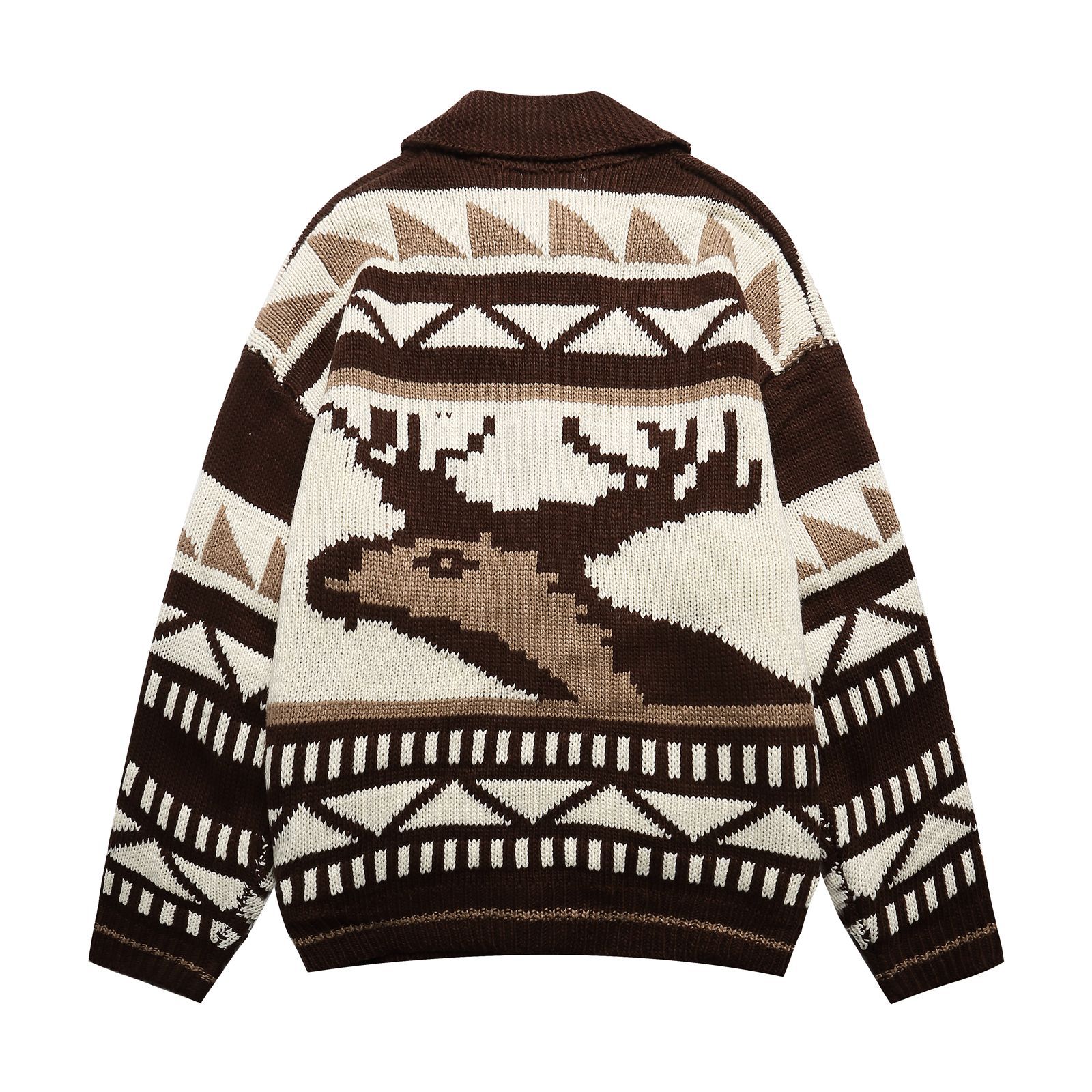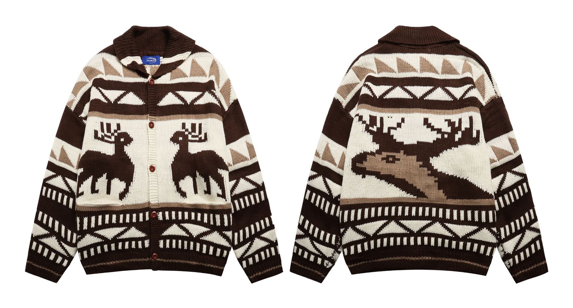 Retro Elk Jacquard Small Lapel Knit Cardigan Loose Lazy Couple Sweater